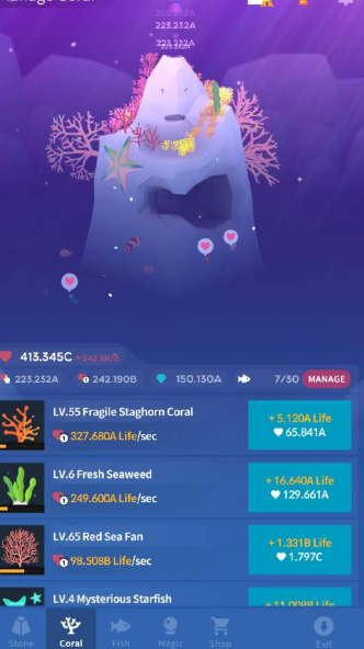 3.珊瑚升级会增加每秒自动生成的生命值,初期比石头有用,当石头等级慢慢高了之后就没什么用了,有剩余的生命的时候可以顺便升级下,使每种珊瑚升一级需要的生命与点击产生的生命级别保持一致即可