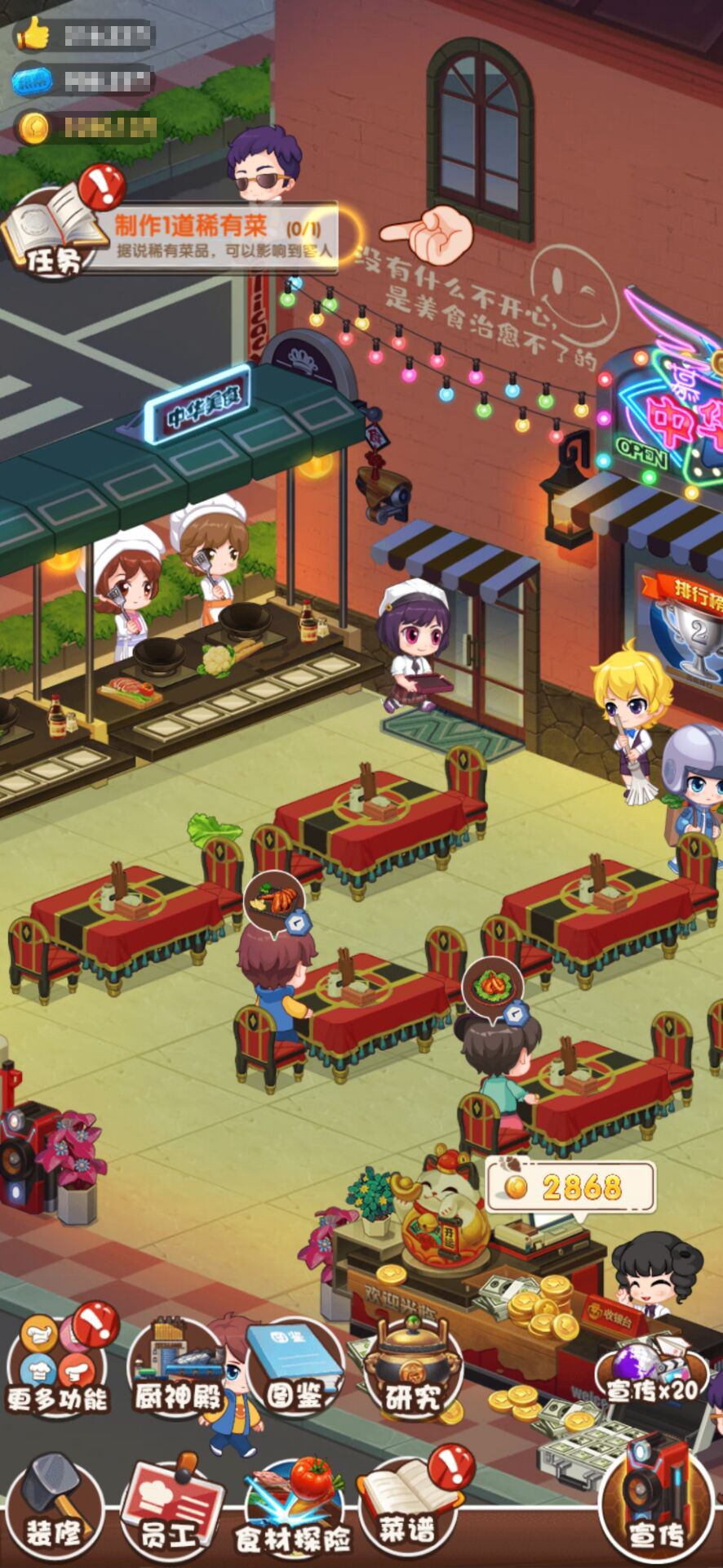 厨神来了游戏破解版解锁更多的神秘菜谱,通过菜品研究进阶,从学会各种常见菜品的制作到学会各种菜系的名菜制作,从黑暗料理逐渐学会专业烹饪手法,解锁更多顶级厨师的专属技能,解锁更多客人,从餐厅升级到美食庄园。