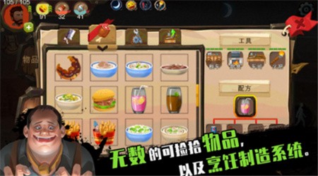 6、数以百计的可捡拾物品,各具特色的自制武器和护甲。 富有深度的制造、升级系统,搜刮材料打造最强装备。 各种食物饮料,以及完整的烹饪系统:昆虫?蜥蜴?还是红酒炖牛肉?