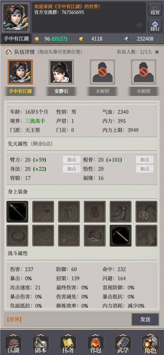手中有江湖游戏是一款文字题材的角色扮演类手游,在手中有江湖游戏中设定了一个常见的武侠小说式的外敌入侵中原、武林纷乱不休的时代,而玩家将操作主角从初入江湖开始逐渐成长,修习武功绝技、获取神兵利器,在江湖上试图闯出自己的名号。感兴趣的小伙伴,快来下载体验一下吧!