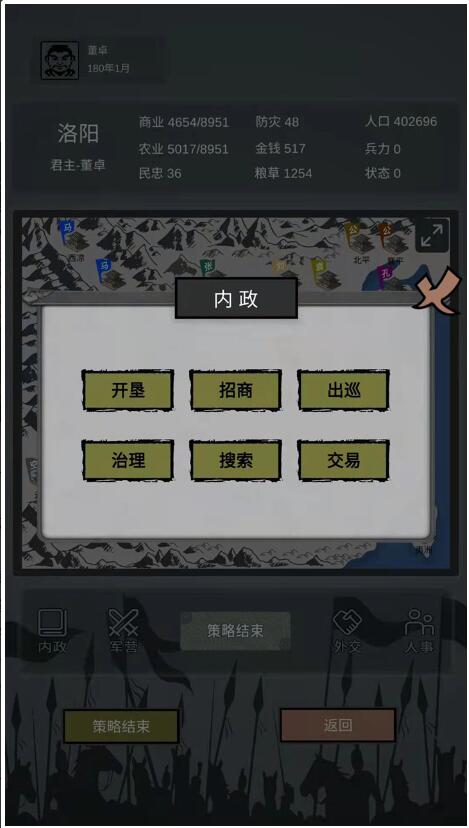 【招商】提高当前城池的商业发展度。商业发展度高,每年的3、6、9、12月份的税收也会提高,有钱才能进行【宴请】、【征兵】等其它的指令;