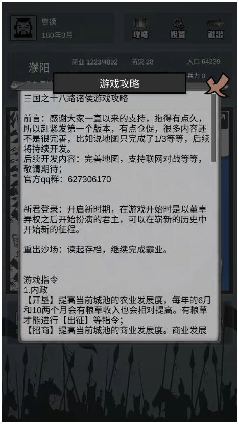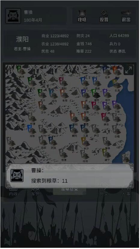 【开垦】提高当前城池的农业发展度,每年的6月和10两个月会有粮草收入也会相对提高。有粮草才能进行【出征】等指令;