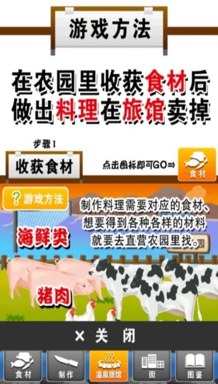 2、游戏方法超级简单。收获食材,参考食谱为旅馆做饭,做出各种各样美味的料理!