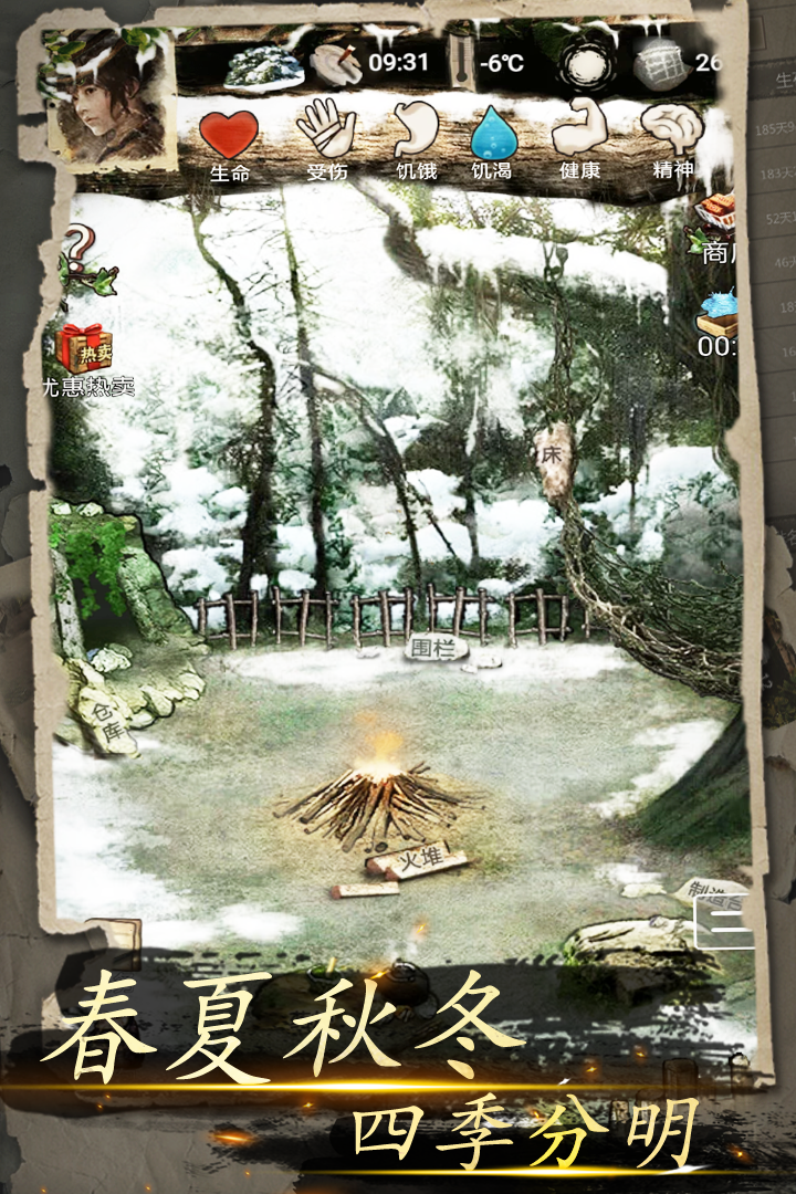 * *游戏设计高度还原现实—春夏秋冬四季分明,春天生气盎然资源丰富,冬天天寒地冻资源匮乏,物资采集,制作,需要合理安排。