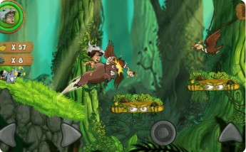 4.在前进的时候玩家们要注意利用道路上的那些道具,例如前面的敌人比较多的时候我们可以跳到树藤上面来躲避开那些敌人,并且拿到更多的得分加成,并且更好地获得更多的得分加成。