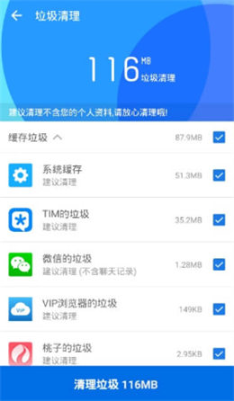 聊天垃圾、应用缓存、视频缓存,各种垃圾一键快速清理,效果真的是666,目前为止用过的最好用的清理手机软件,之前体验就是因为广告太多,现在用这款去广告版真的很舒服,重要文件还会提醒一下,非常不错的!