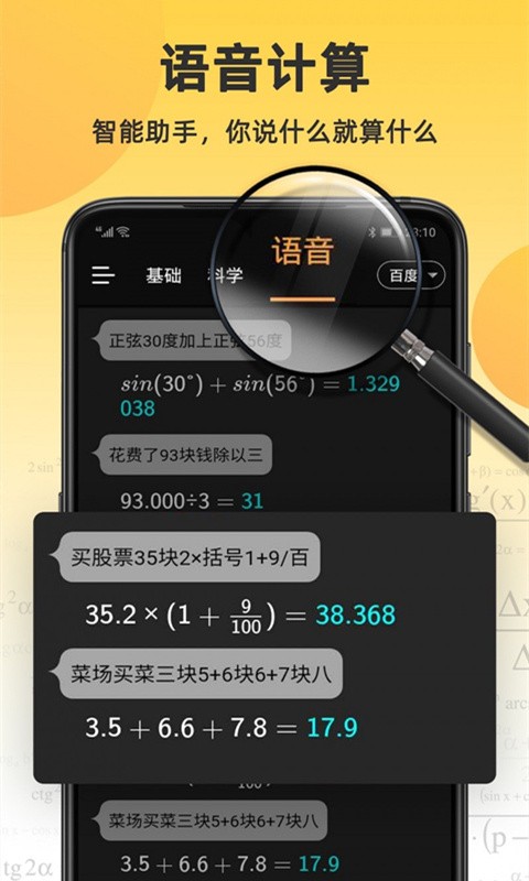 语音计算器是一款专为广大用户打造的安卓语言计算器手机应用软件,能够在帮助用户计算数据的同时实时语音播报出来,让计算更明朗,有多种计算模式,更专业准确的为你计算,非常实用方便,可以实时播报计算过程和结果。 扩展功能强大,集计算器、科学计算器、分数计算器、汇率换算、亲戚计算器、房贷计算器、五险一金、日期计算器、进制转换、理财计算、自定义公式、单位换算等为一体,功能强大,方便好用,简单解决各种计算、换算的超级计算器。