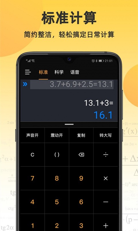 语音计算器是一款为广大用户打造的安卓语言计算器的手机软件,可以能够帮助用户计算数据的同时去实时的用语音播报出来,非常的用心,还可以让计算更加的明朗,还有多种计算模式,更加专业精准为你计算,左侧滑动抽屉呈现近期计算历史,应广大用户要求持久储存,修正计算结果为负数情况下继续输入有可能计算不准的问题,让用户更短的时间内算出大量的数据结果,喜欢吗,喜欢就快快下载吧。