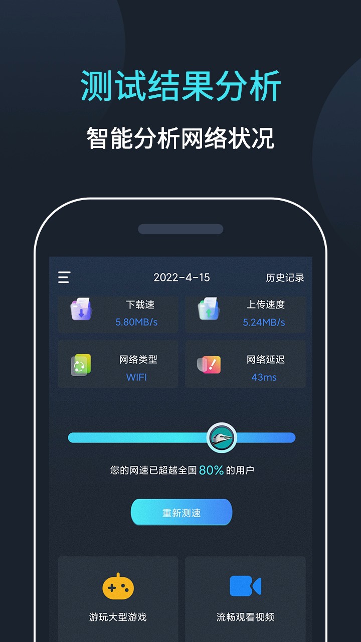 1、允许用户一键测试当前网络状态,从而清晰了解网速和网络状态。