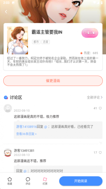 1、任何用户的阅读记录都存储在云端,可以随时打开应用程序,收集和阅读您最喜欢的漫画资源。